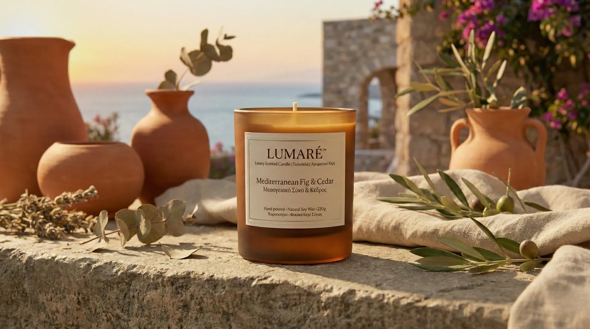 Our work focused on capturing the "golden hour" light—ensuring the warm wax, textured ceramic vessel, and the interplay of shadows from olive branches felt authentically Mediterranean and premium.