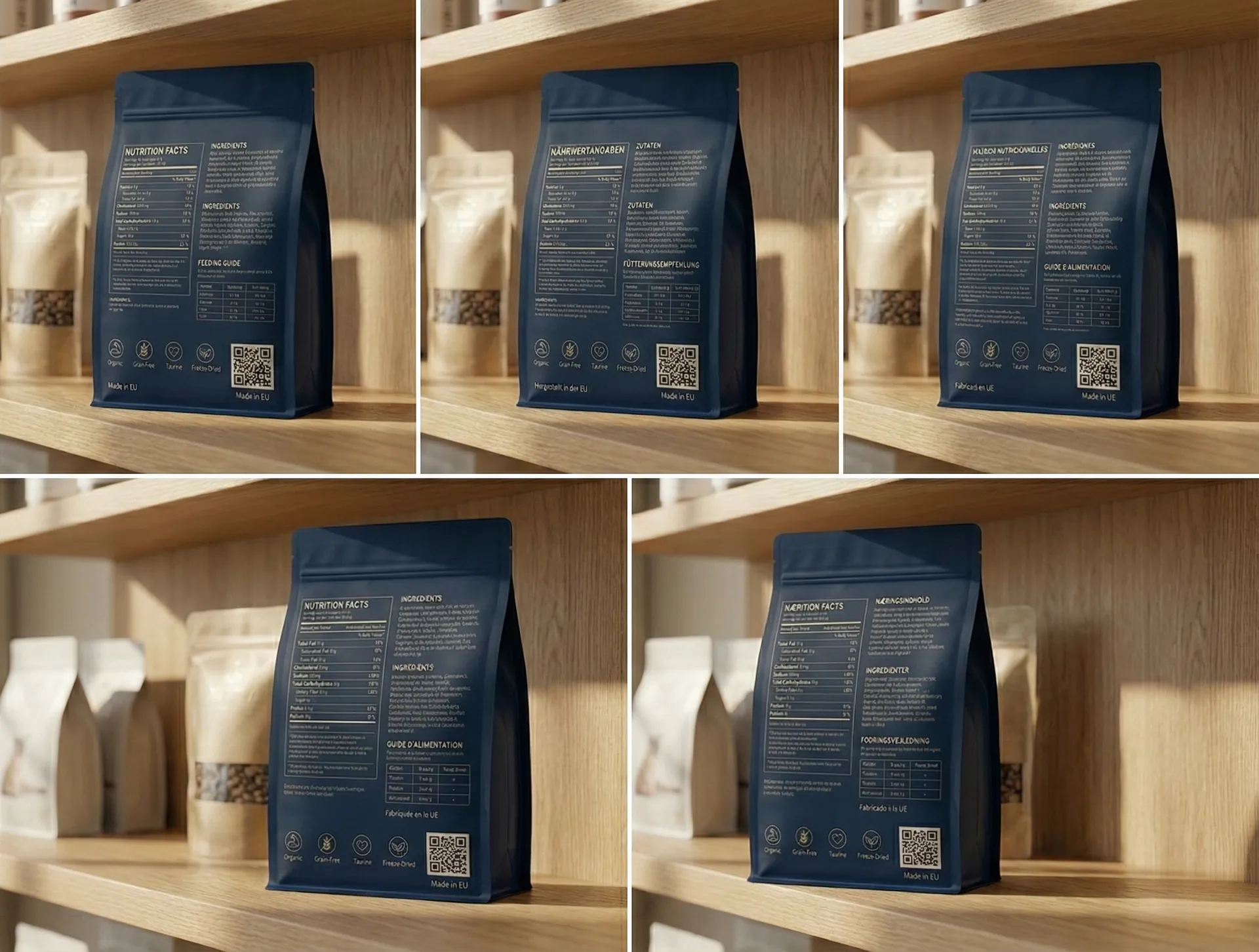 We needed a consistent, multilingual back-label system (EU compliant), plus unified iconography for nutritional benefits and organic certification.