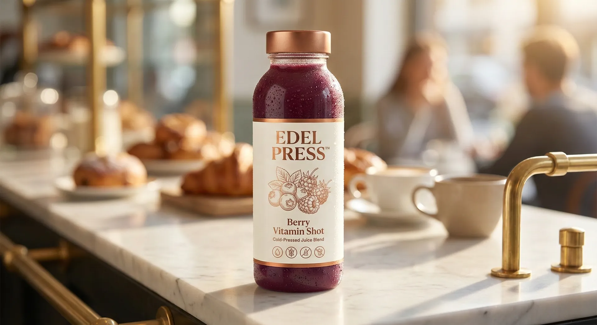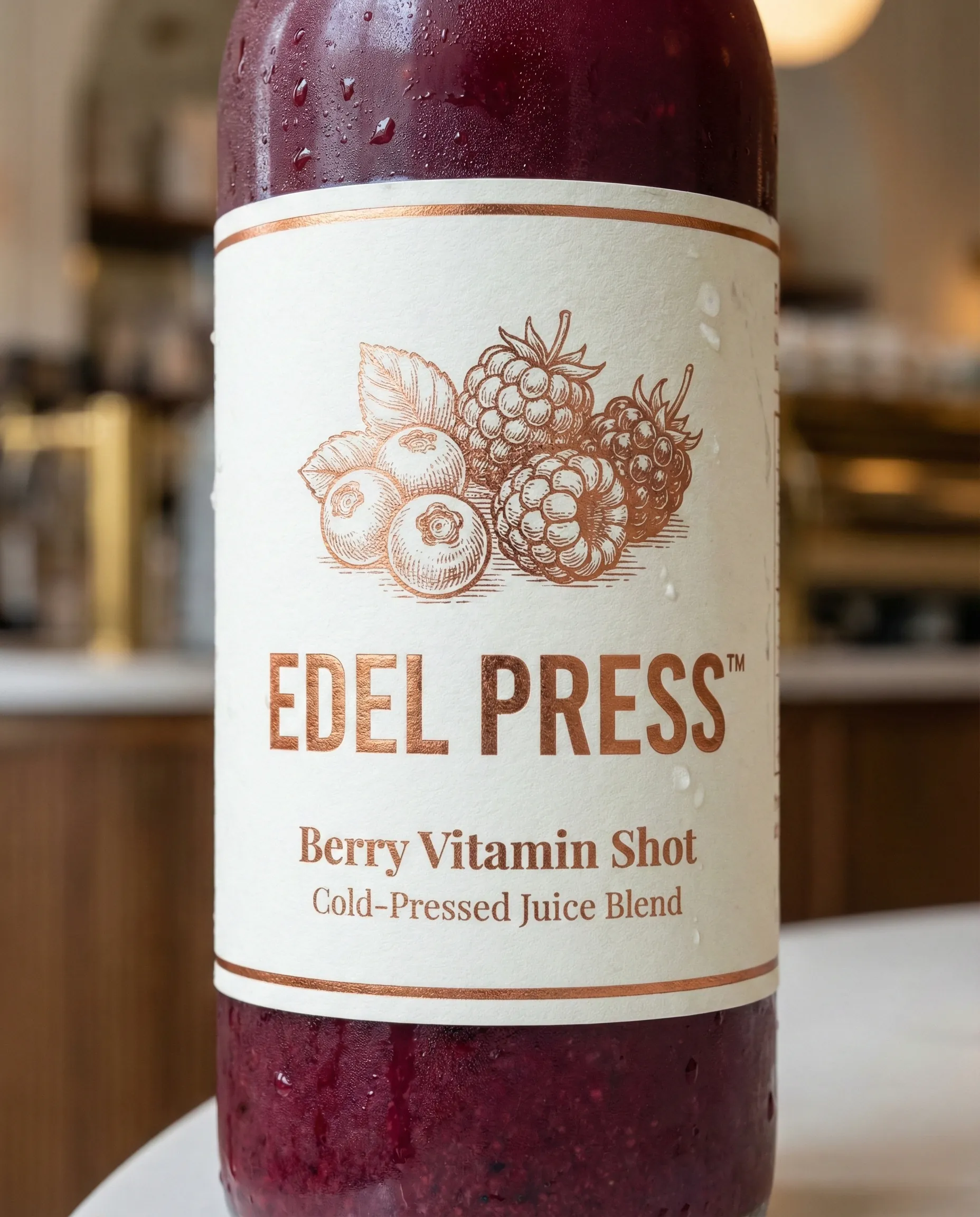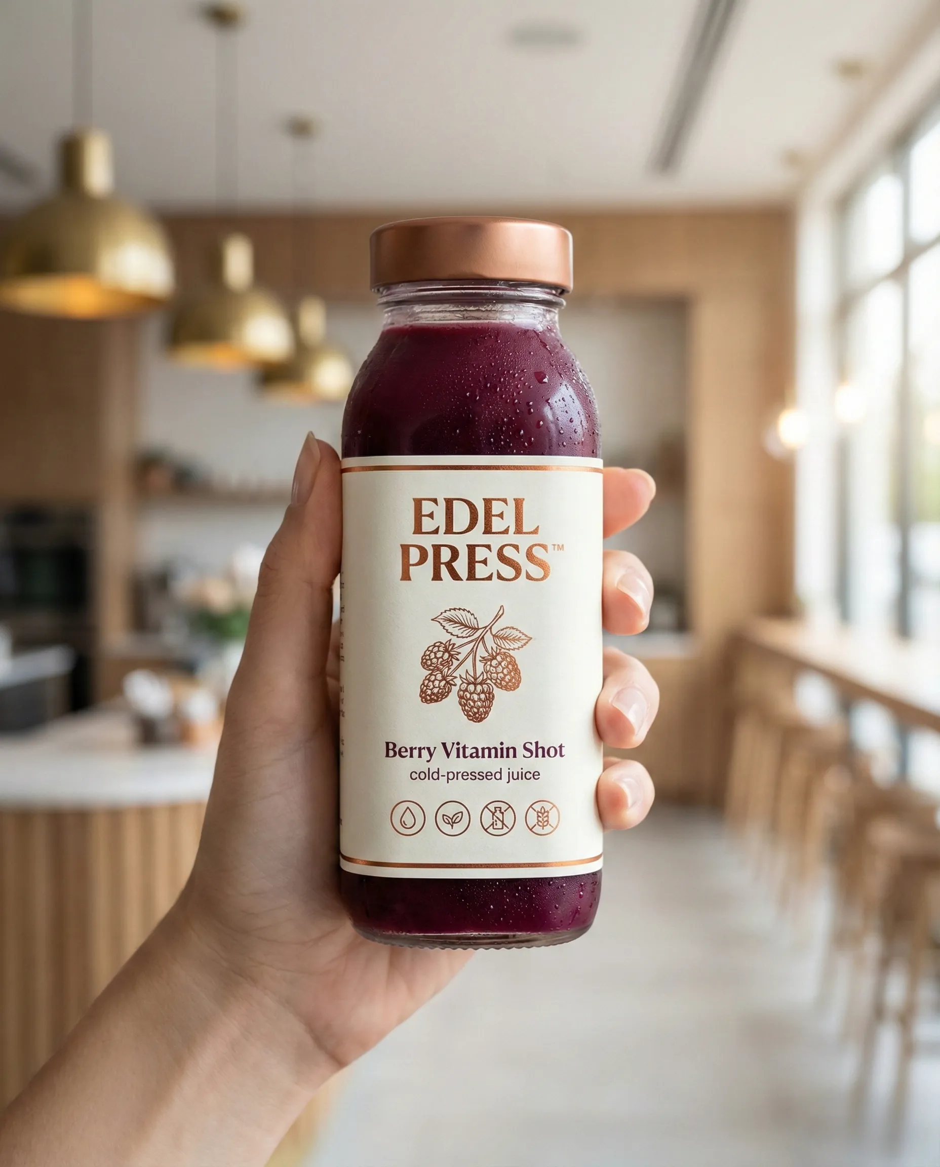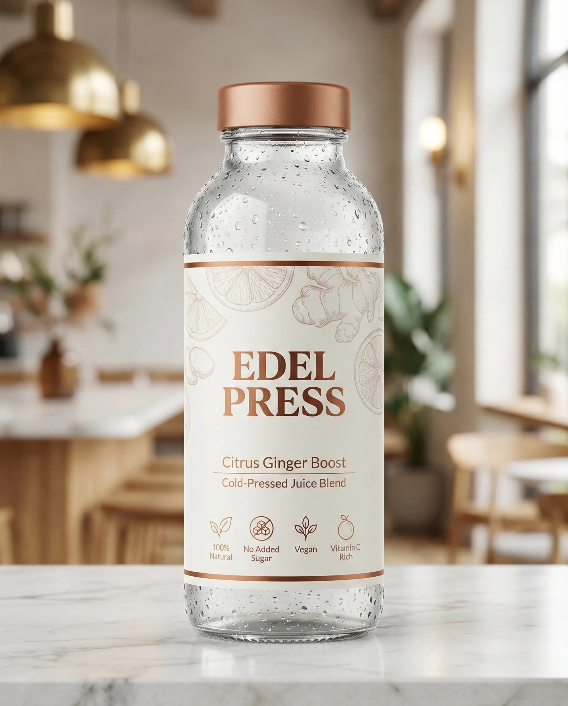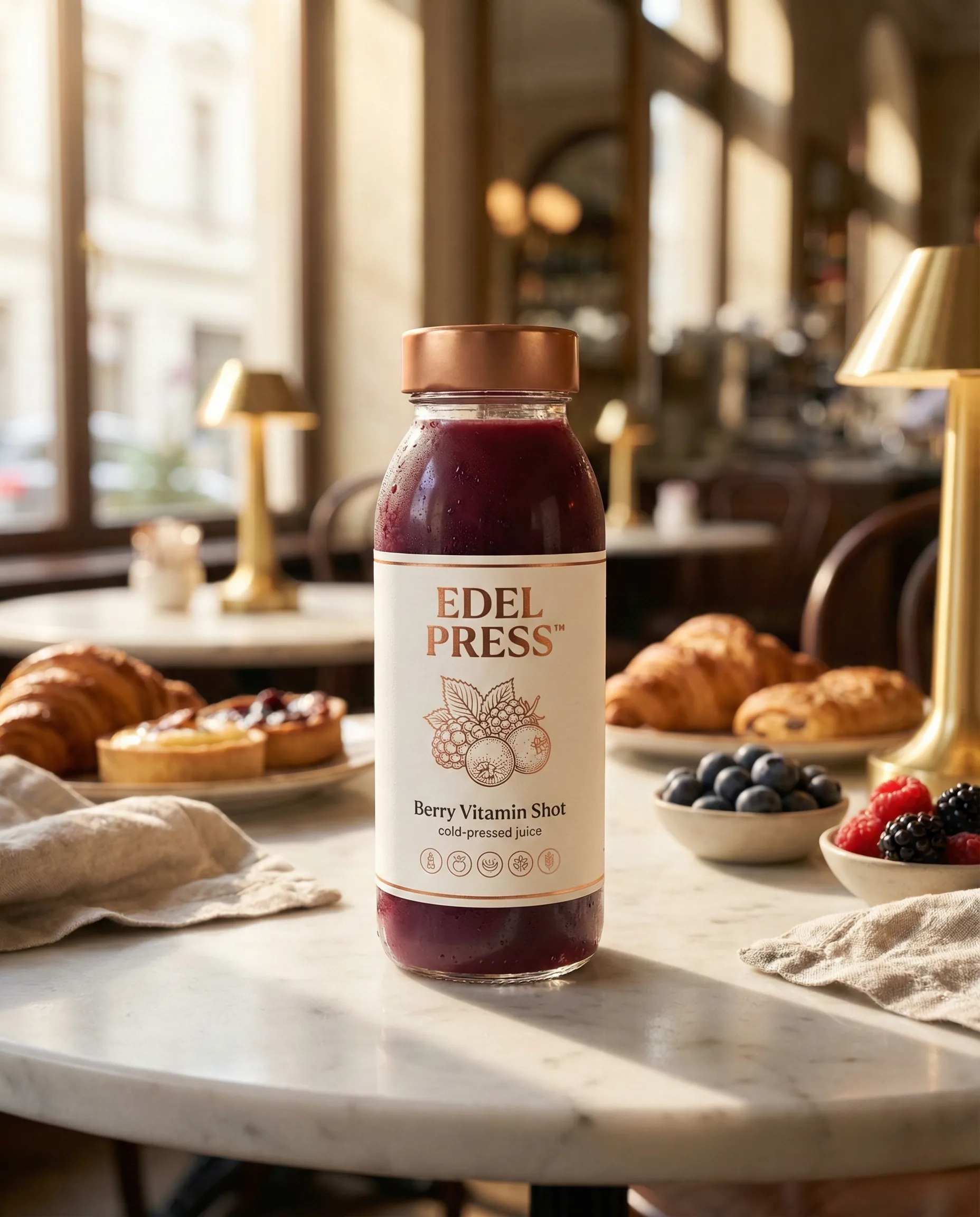 EDEL PRESS™ is a premium, cold-pressed EU juice brand focusing on natural, vegan, café-ready beverages with copper-accent aesthetics.
