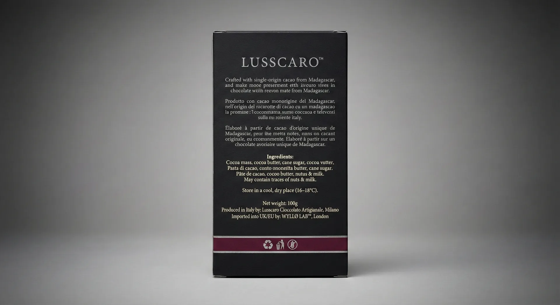 The client asked WYLLOLAB™ to create a hero packaging system and visual toolkit for their 70% Madagascar Cacao bar: something that would feel at home in an artisan cioccolateria, but also photograph perfectly for e-commerce and international distribution.