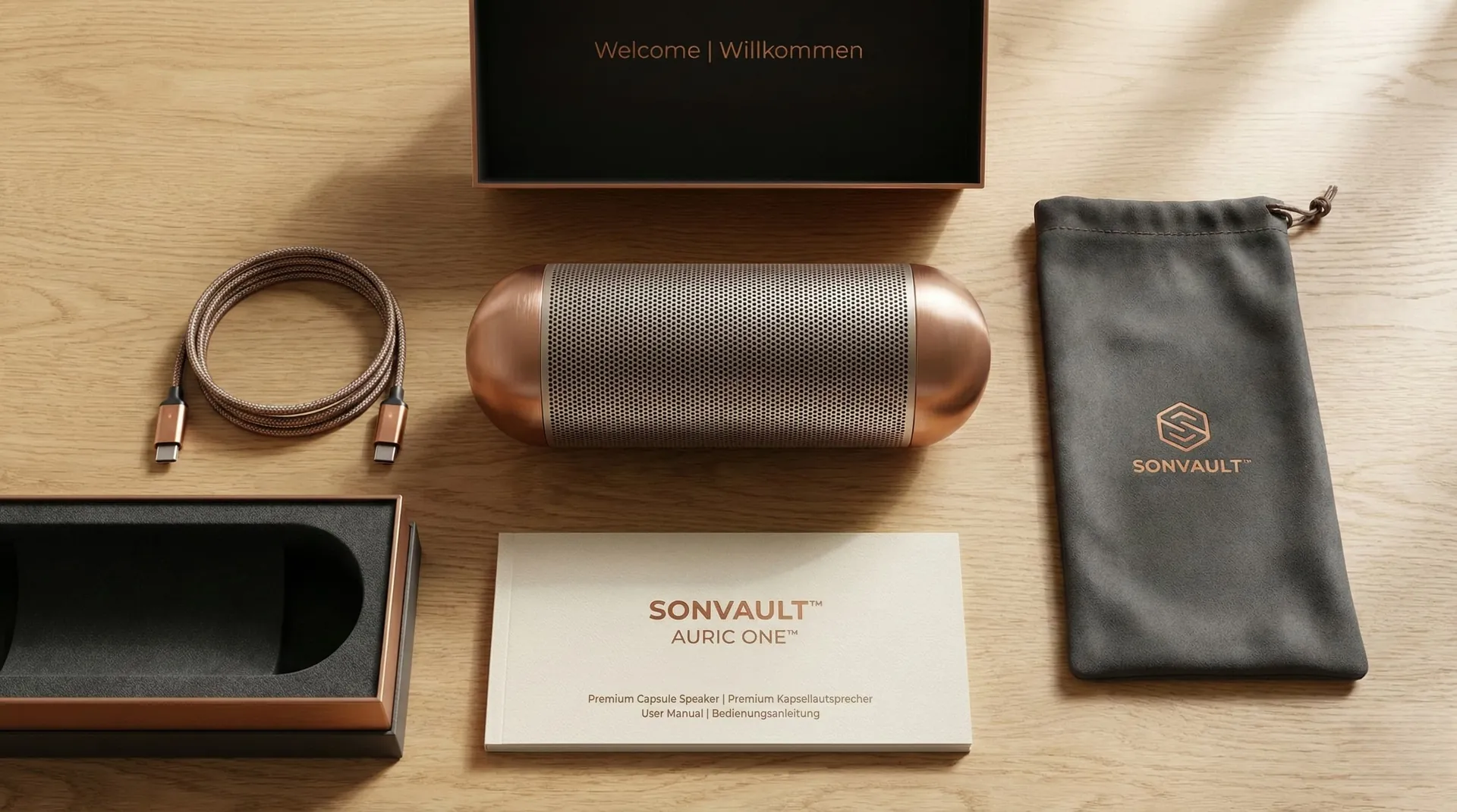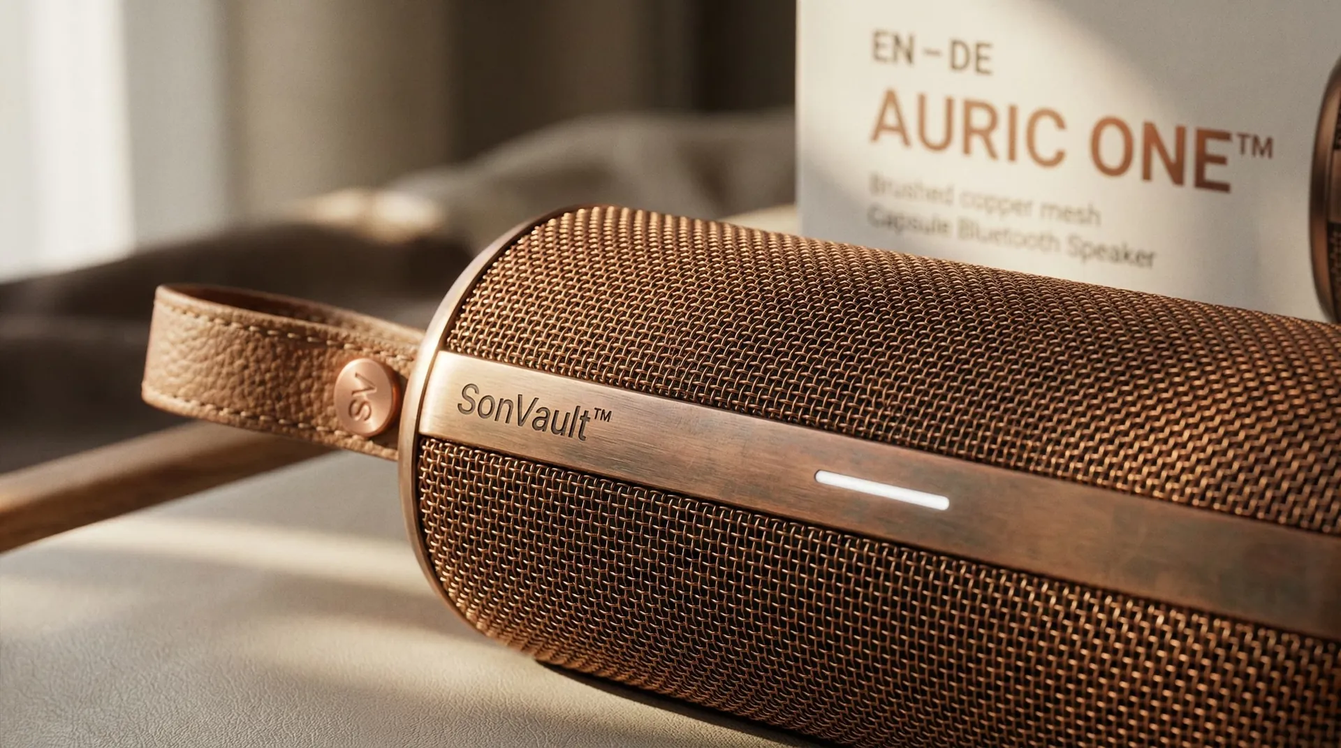 Sonvault™ required a definitive visual identity for their flagship release, the Auric Audio Capsule. This high-end wireless speaker was designed to sit at the intersection of boutique furniture and cutting-edge audio technology. The objective was to create a visual suite that captured the tactile contrast between the precision-milled copper grille and the acoustically transparent fabric wrap.